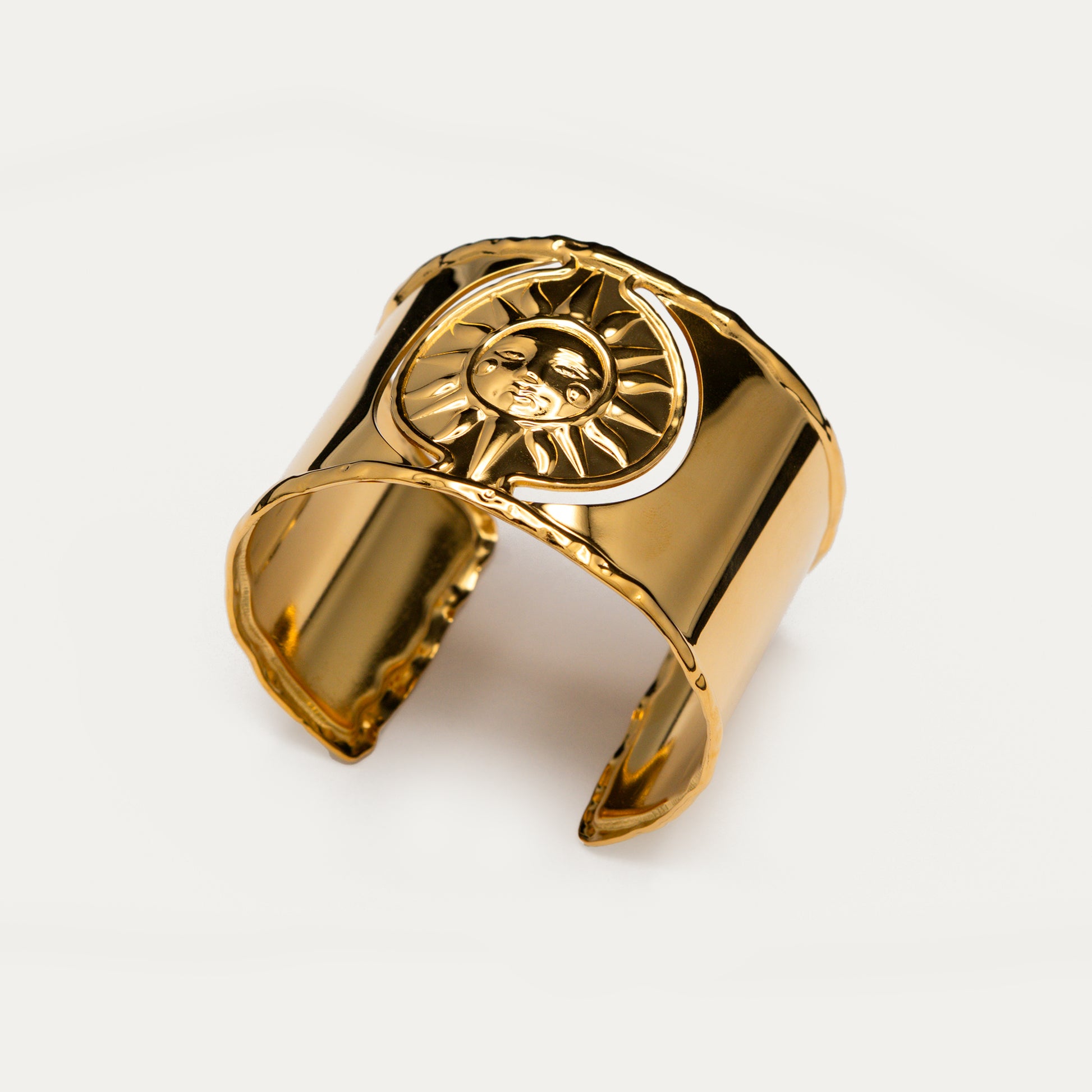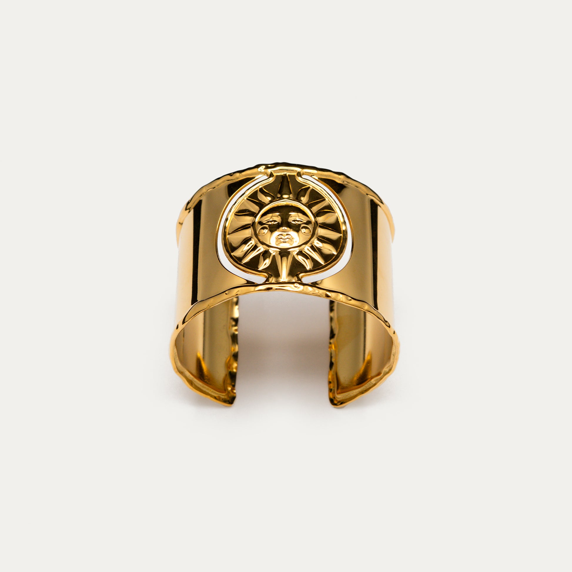 Bold, sculptural, and finished with a golden sun at the center, this cuff-inspired piece is made to stand out. Made from 18K coated stainless steel, this bangle is easy to adjust and impossible to ignore.