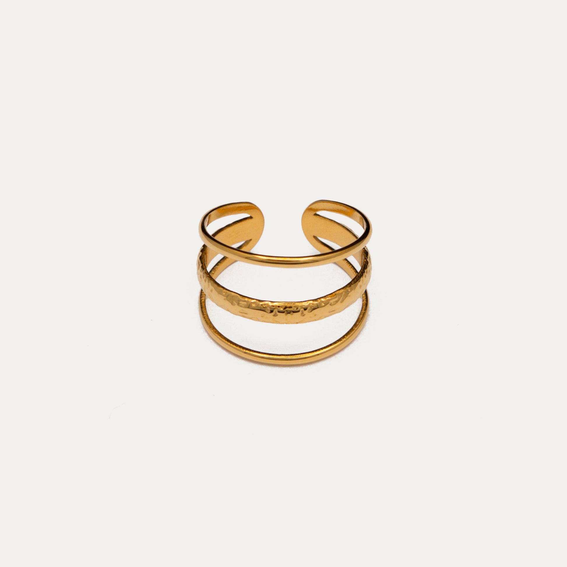 This ring mimics the look of three perfectly layered bands in one easy design. Made from 18K coated stainless steel, this ring is simple, striking, and always ready to shine.