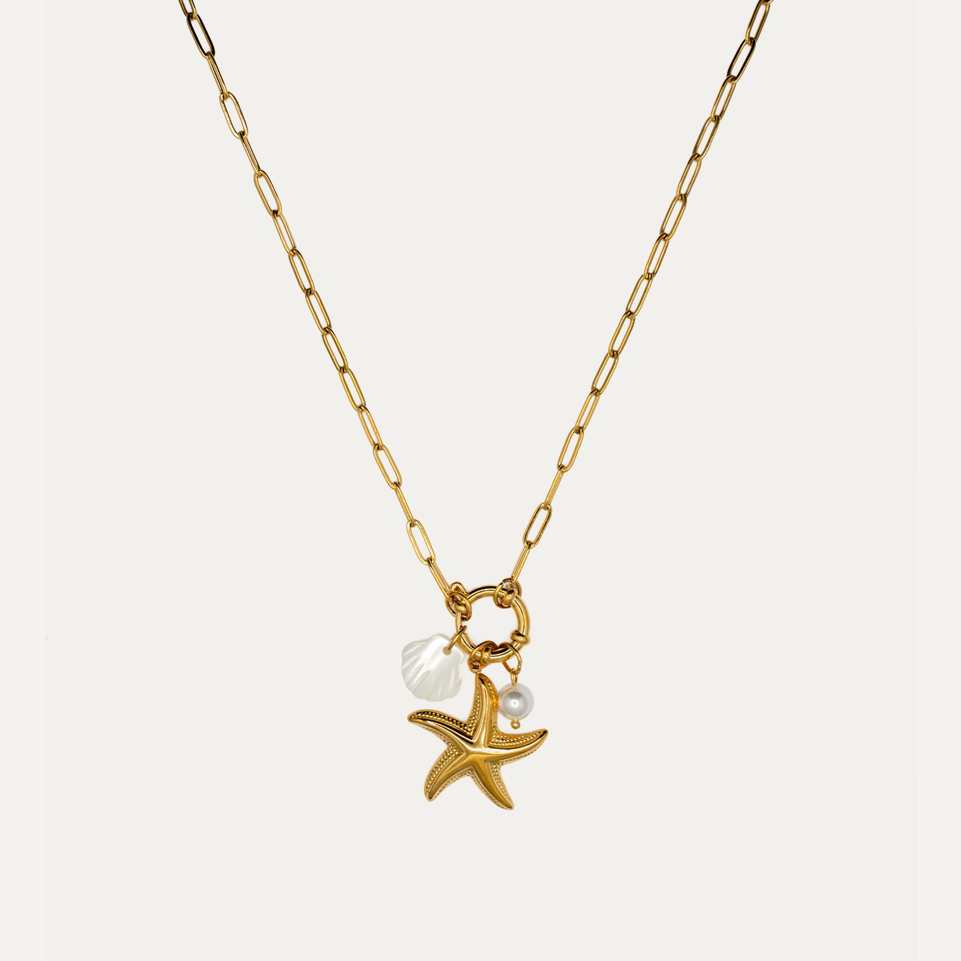This charming necklace features three delicate pendants, a starfish, a shell, and a pearl. Made from 18K coated stainless steel, this necklace is light and chic, making it the perfect accessory for those who'd love a touch of seaside around their neck.